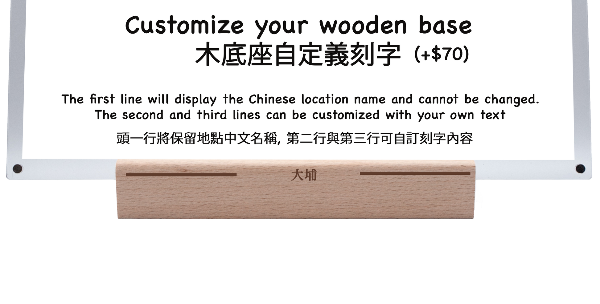 Wooden base size: 20cm wide x 7cm high x 3.5cm (beech)