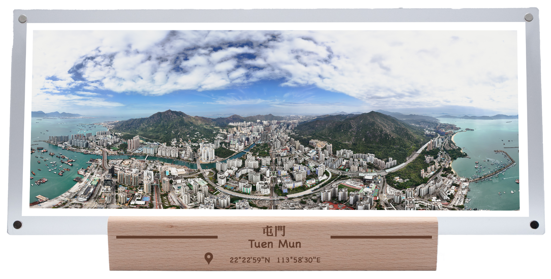 This aerial panorama shot of Tuen Mun, Hong Kong, shows the magnificent interweaving of city and nature. On the left side of the picture, you can see dense residential areas and cargo ships anchored at the estuary, reflecting Tuen Mun as an important transportation and living hub in the New Territories West. In the center is the majestic Qingshan Mountain Range, which is lush and green, forming a sharp contrast with the dense buildings, showing the unique topographical features of Tuen Mun. On the right side, you can see the Gold Coast and the long bay, connecting to Lantau Island in the distance, showing the diverse landscape of Tuen Mun from the urban area to the leisure area. The overall picture combines natural landscapes with modern cities to form a visual experience with great layers and depth.