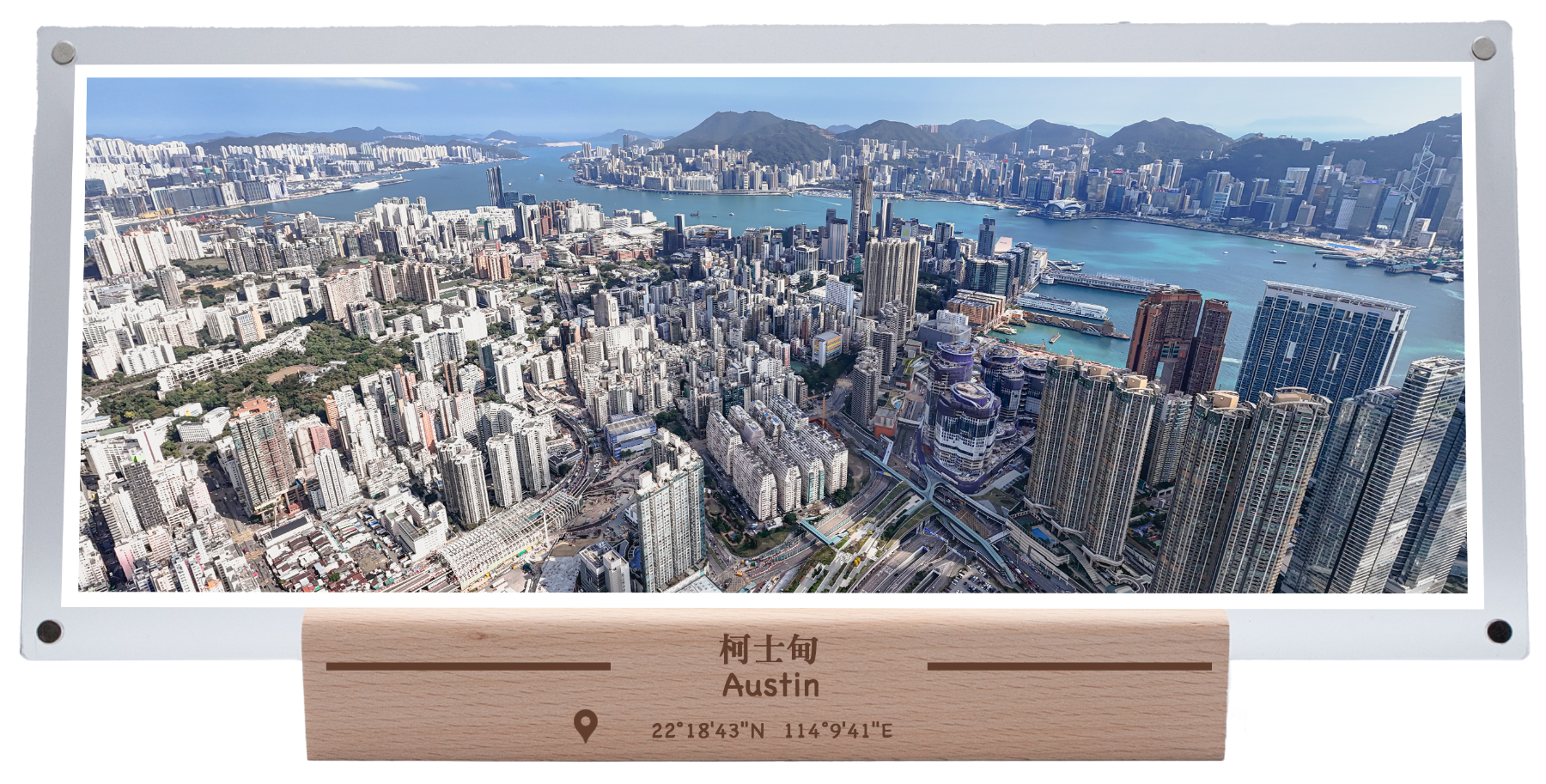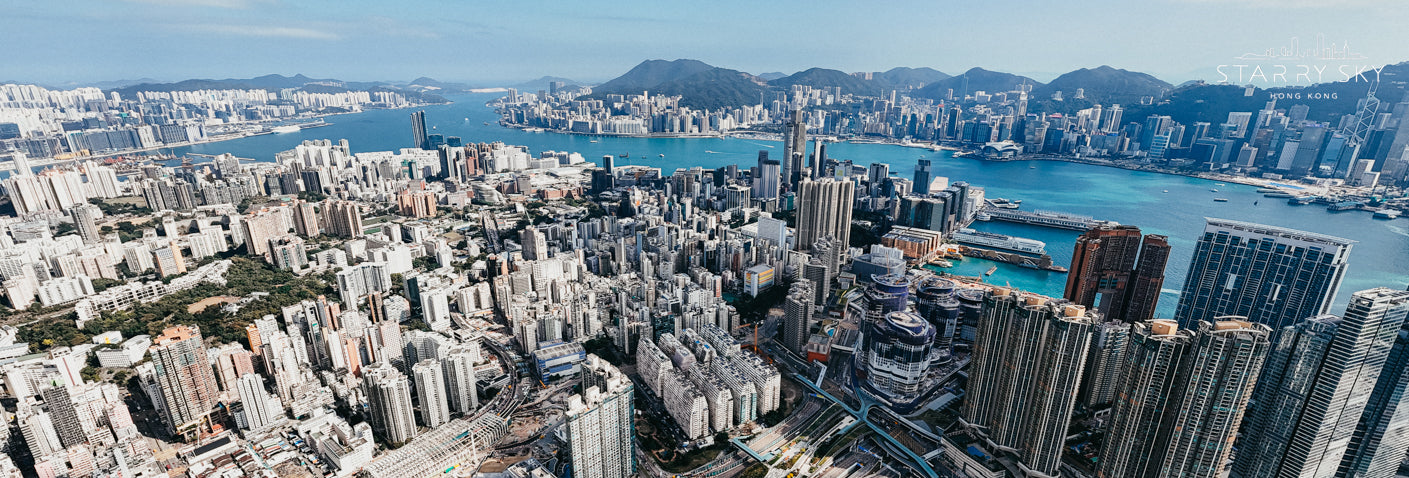This spectacular bird's-eye view captures the bustling city of Austin, Kowloon, Hong Kong. In the center of the picture, you can see densely packed high-rise buildings, showing the city's high level of development and vitality. The blue waters of Victoria Harbour on the right contrast sharply with the Central and Admiralty areas of Hong Kong Island on the other side, showing the geographical and architectural characteristics of Hong Kong as an international financial center. In the foreground, you can see landmark buildings such as Elements shopping mall and the International Commerce Center (ICC), with railways and highways crisscrossing through it, reflecting its status as a transportation hub. The undulating mountains in the distance form a unique blend of nature and city with the bustling urban scenery.