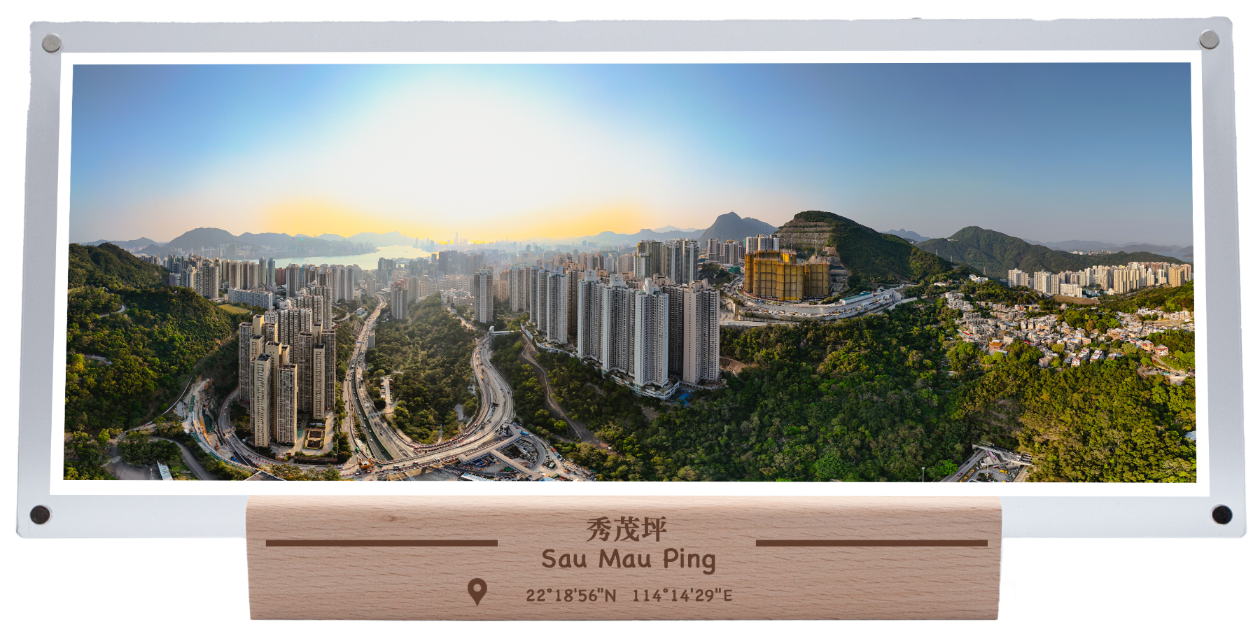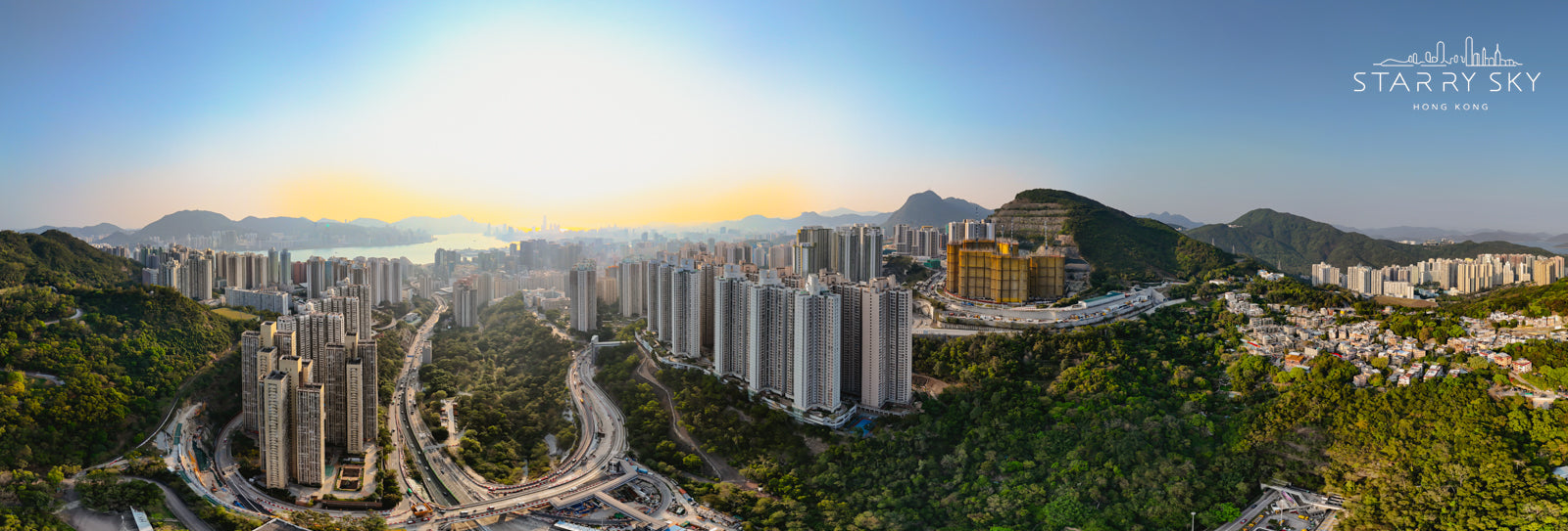 This photo shows an aerial view of Sau Mau Ping and its surroundings. In the centre is a dense, neatly arranged cluster of public housing estates and high-rise residential buildings, marking the community structure of Kowloon East. New residential projects can be seen under construction on the right, indicating that the area is still actively developing. Roads and tunnels extending from the hillside on the left and below show the planning of the area's transportation infrastructure and its connection to the overall urban network. In the distance, Victoria Harbour and the skyline of Hong Kong Island can be seen, adding a soft halo to the city in the sunset. This picture combines natural mountains, urban residential and infrastructure development, highlighting the characteristics of Hong Kong's urban development and topography.