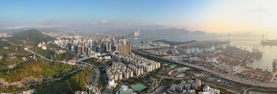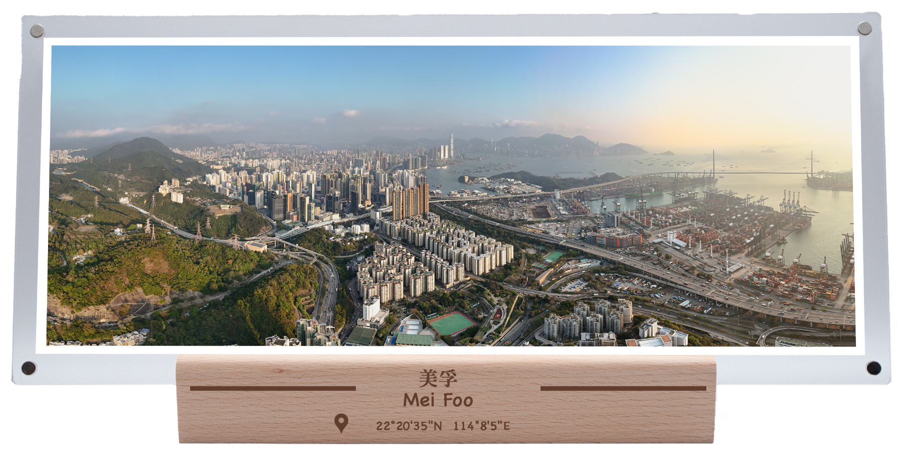 This aerial view shows Mei Foo and its surroundings, highlighting one of Hong Kong’s key transport and logistics hubs. On the right is the Kwai Chung Container Terminal, with neatly arranged containers and gantry cranes clearly visible, symbolizing Hong Kong’s importance as a global trading port. The residential area to the left of center is Mei Foo Sun Chuen, one of Hong Kong’s early large private housing estates, with its neatly-knit residential buildings connected to the MTR lines to form a complete community. In the distance, high-rise buildings can be seen on both sides of Victoria Harbour, with the West Kowloon and Central skylines facing each other. The hillside and highway on the left show the coexistence of the region’s main traffic arteries and the natural environment, showing the integration of mountains and sea in urban planning. The overall composition shows the magnificent scenery of the urban and port development in western Hong Kong.
