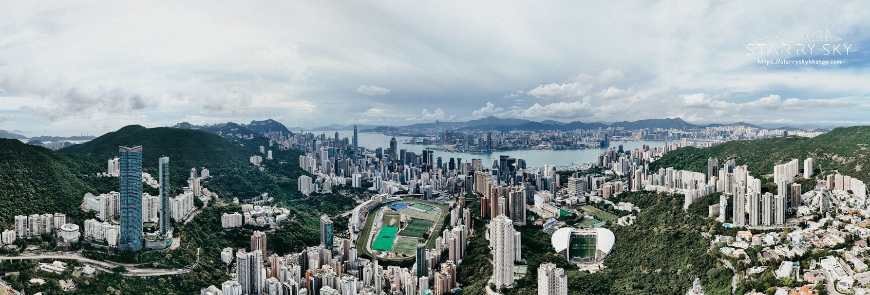 A bird's-eye view of the entire Hong Kong Island and Kowloon from Happy Valley. The center of the picture is the famous Happy Valley Racecourse, with green hills and towering residential buildings on the left and the Hong Kong Stadium on the right. Victoria Harbour runs through the center of the city, and on the other side is the Kowloon Peninsula. In the distance, you can see layers of high-rise buildings and green mountains. The wide field of vision shows Hong Kong's unique urban mountain and sea landscape, which is of great collection and decoration value.