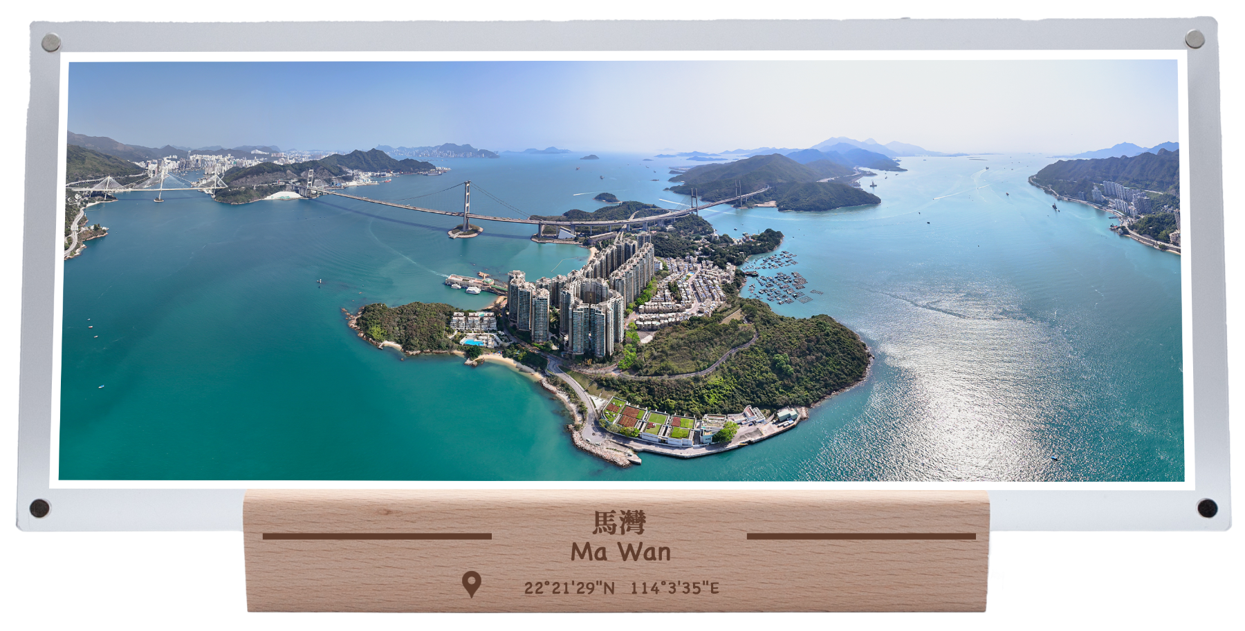 In the center of the picture is Ma Wan Island, where the high-rise residential complex is the famous "Park Island" private housing estate. The buildings are surrounded by green space and the coast, presenting a peaceful atmosphere of a seaside community. On the left, across the channel are the spectacular Ting Kau Bridge and Tsing Ma Bridge, which are important trunk roads connecting the New Territories and Lantau Island, and are also an important part of the transportation between Hong Kong Airport and the urban area.