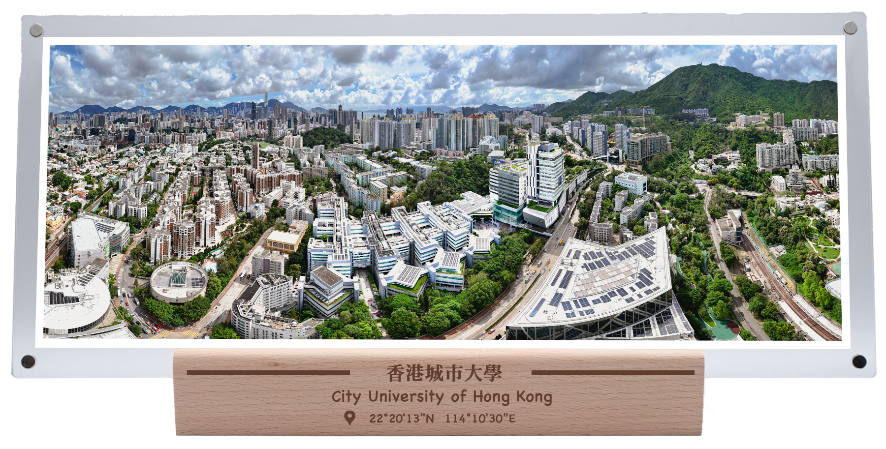 香港城市大學全景相架 - 從高空俯瞰整個CityU校園,現代化建築群層次分明,獨特嘅建築設計配搭綠色天台,背靠獅子山脈,前臨九龍塘住宅區,完美體現咗城市大學融入都市脈搏嘅特色!